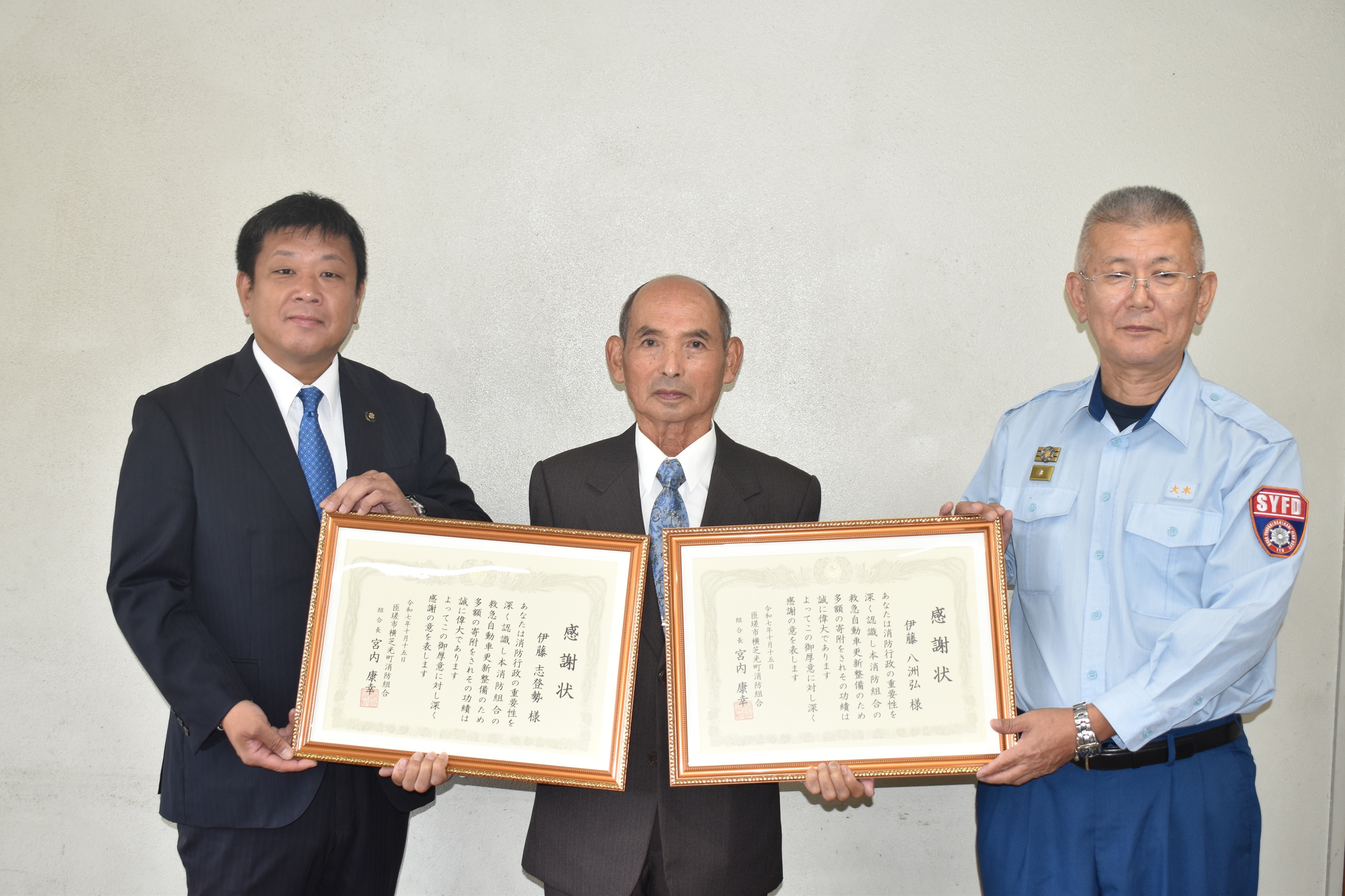 令和7年10月15日、匝瑳市横芝光町消防組合では、匝瑳市在住の伊藤八洲弘様、伊藤志登勢様より、当消防組合に対し、高規格救急自動車更新費用としまして、多額のご寄附を賜りました。 このご厚意に感謝申し上げ、感謝状の授与式を執り行いました。
